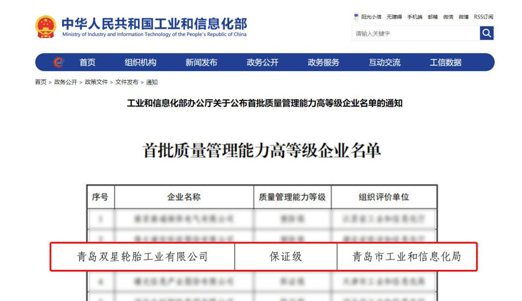 • 行業(yè)唯一!雙星輪胎入選工信部質量管理能力高等級企業(yè)名單